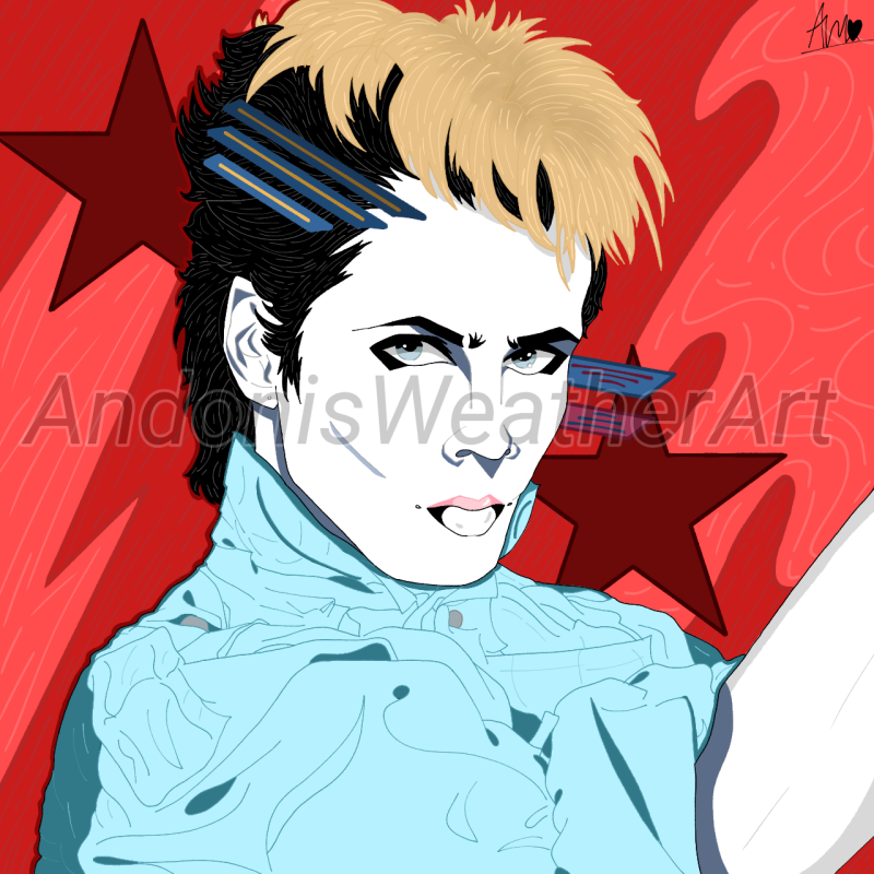 This piece was created in July 2024 in celebration of gifting art to Nik Kershaw at the Let's Rock Festival. It features bright, bold colours of red, white and blue with smaller, minor details to make the image stand out. It is one of Andonis' favourite pieces he's created and is available to buy in the store.